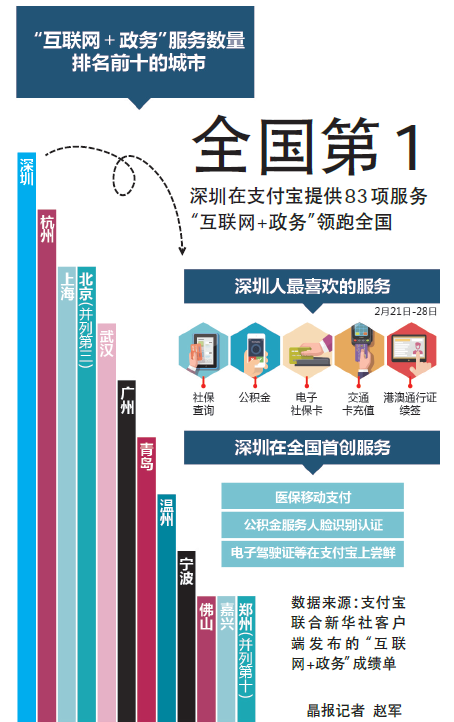 这份成绩单上,深圳市的“互联网+政务”服务数量多、首创多。深圳市在支付宝上为市民共提供83项城市服务,位列三甲,其次分别是杭州和上海。深圳公积金、社保查询、电子社保卡、交通卡充值、港澳通行证续签是两会前一周大家最喜欢的5个服务。
