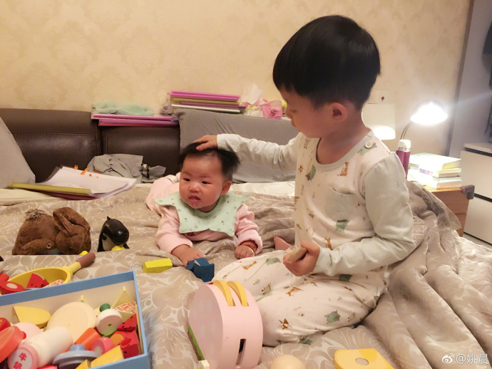 3月6日,姚晨在微博晒出儿子小土豆与妹妹茉莉嬉戏打闹的场景,之后小土豆还为妹妹擦口水,画面温馨。