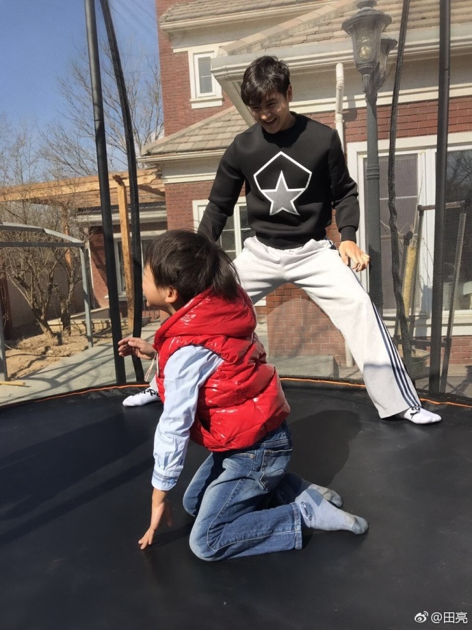 3月6日,田亮在微博晒出带儿子在家门口玩蹦床的照片,小亮仔空翻超厉害,网友表示:“我只看到身后的大别墅。”