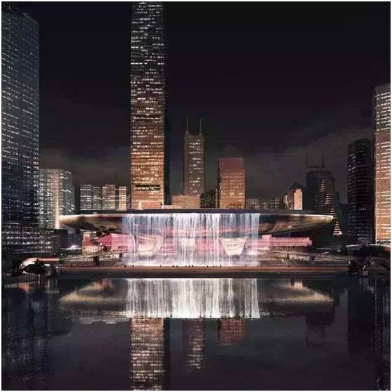 艺术中心面对红岭路的一侧,设计了一座从楼顶飞流而下的瀑布,瀑布将从楼顶流向马路对面的荔枝公园。佳兆业环球金融中心
