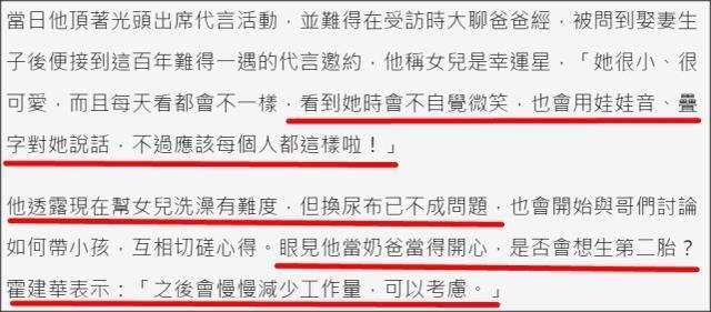 霍建华回家了之后,会帮心如一起带孩子,特别心疼心如,带孩子很辛苦,当谈到他在家与女儿相处时,霍建华整个人都变得特别温柔,微笑着说:“她很小,很可爱,而且每天看都会不一样,看到她时会不自觉的笑,也会用娃娃音、叠字对她说话”,他还透露现在帮女儿洗澡有难度,但换尿布已不成问题。