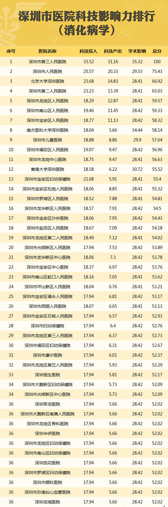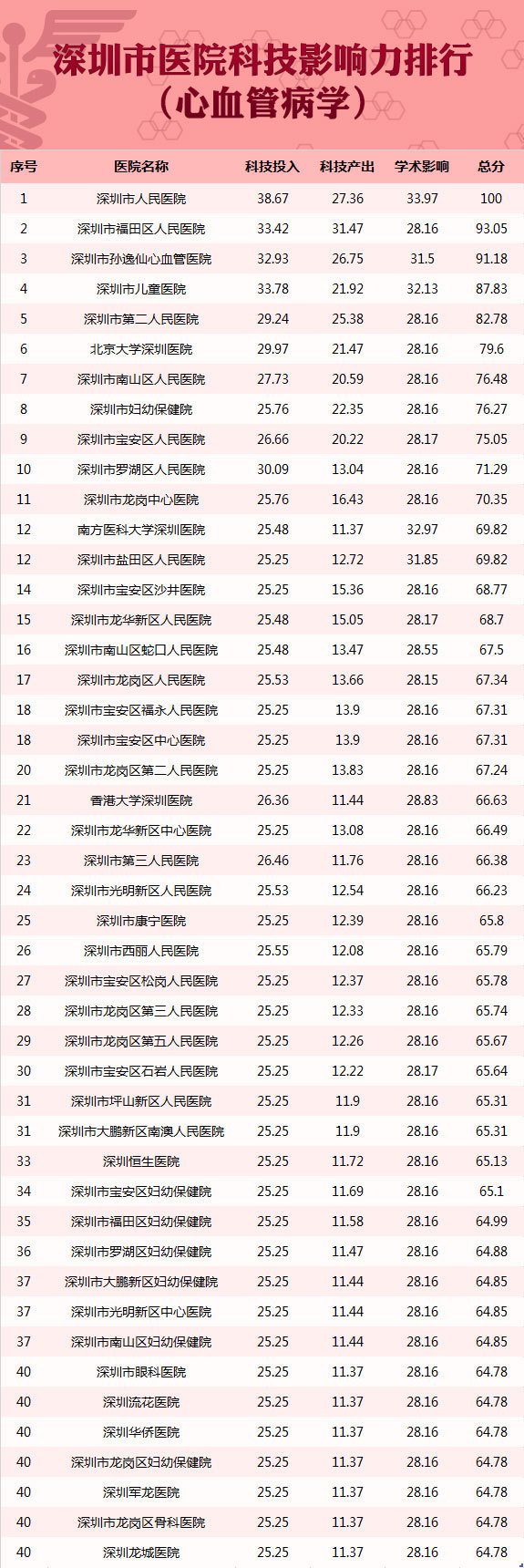 3月9日,深圳市召开全市卫生计生科教工作大会,深圳市卫生计生委首次发布了医院科技影响力排行榜——深圳市“十二五”医院科技影响力排行榜,这是委托委托中国医科院医学信息研究所制定的第三方权威排名,对全市52家二级以上医院进行了评估,形成综合榜单和26个学科的单项榜单。
