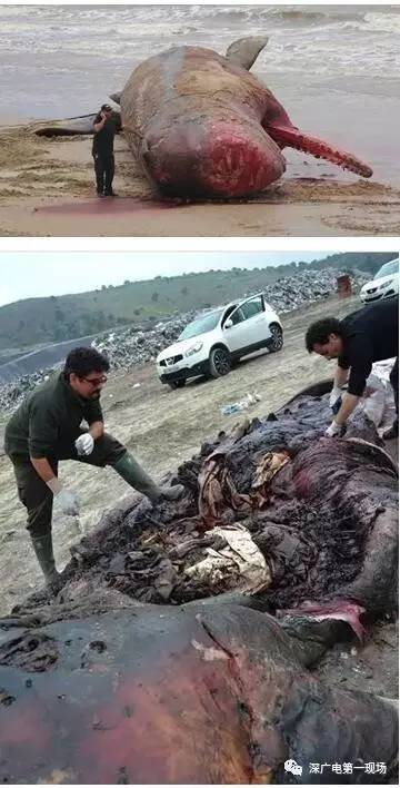 在科学家们进行研究性解剖工作时,发现这头抹香鲸的胃里有几乎装满了垃圾…