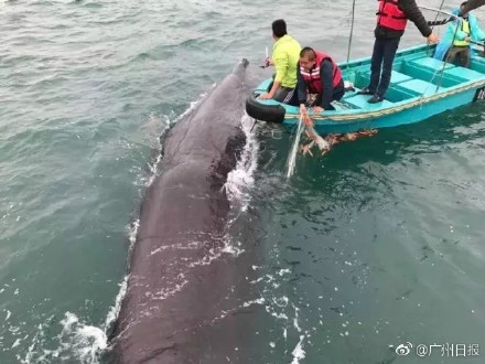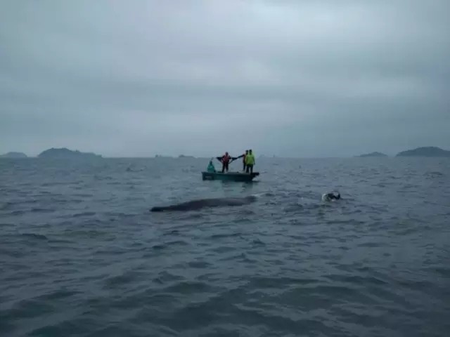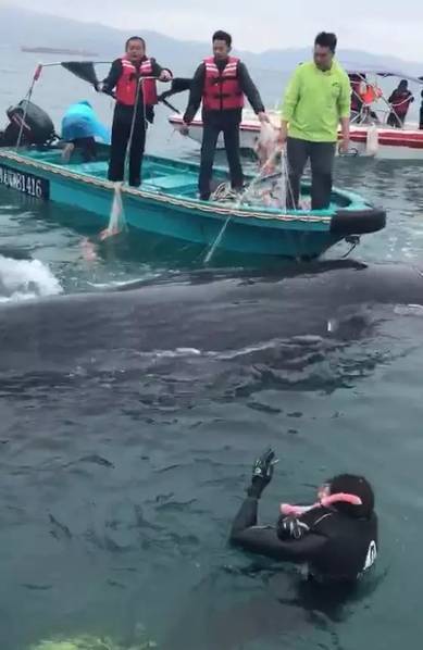 经过近3个小时的紧张处理,渔政大队工作人员、潜水员及热心渔民成功清除了鲸鱼身上的渔网。