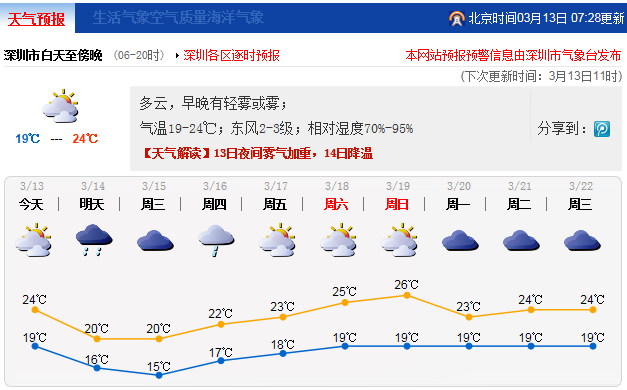 深圳市气象台预计,未来一个月深圳雨雾多发,雷暴增多。预计3月14-16日、29-31日将有两次冷空气影响,并伴有阴雨天气;雨雾多发,沿海地区易出现局地大雾;3月21-22日、29-31日和4月8-9日前后有三次明显降水过程,伴有雷暴。