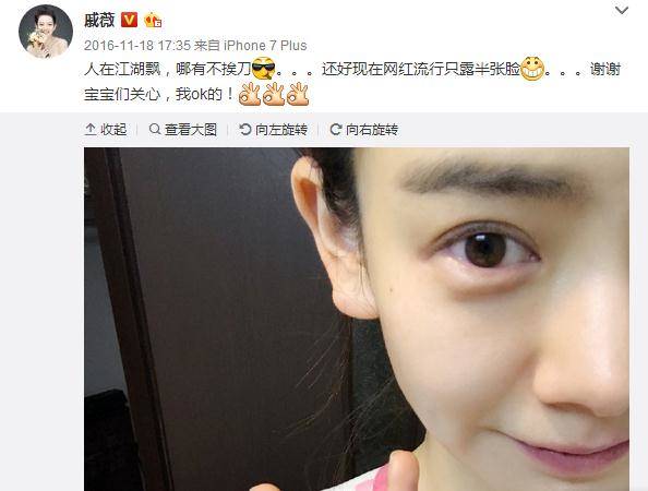 受伤后的戚薇还自信的表示:“人在江湖飘,哪有不挨刀!还好现在网红流行只露半张脸。”没想到她“只露半张脸”一语成谶成为她以后自拍的常态。