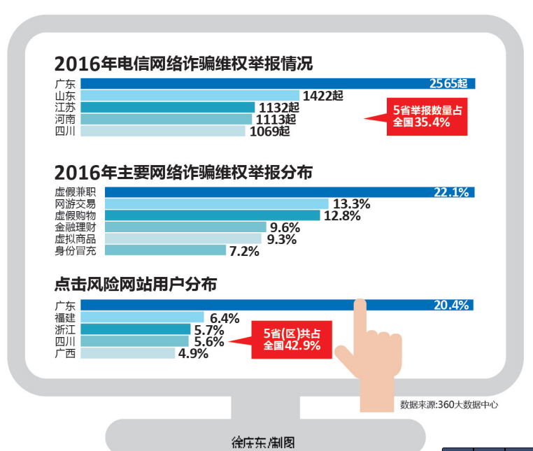 来自360浏览器的数据显示,尽管对钓鱼网页进行了风险提示,依然有很多用户执迷不悟点开网站,给自己带来风险;从城市角度看,深圳、东莞、广州等地用户月度平均点击量在1500万次以上。“相对来说,面对风险提示,南方人比北方人更容易‘轻敌’,无视风险而继续操作。”360安全专家说。(记者赵军)