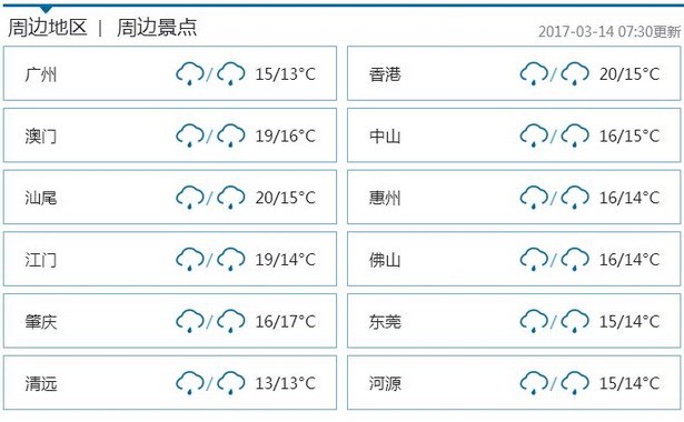 据深圳市气象局发布的消息称,12日夜间到13日白天,深圳阴天到多云,早晨最低气温介于18-20℃之间,白天最高气温27℃左右;吹和缓的偏东风;空气潮湿,最大相对湿度普遍在95%以上;夜间至上午有轻雾,东部沿海能见度低于1公里的大雾天气,午后能见度逐渐转好。市气象台于13日8时35分至11时45分在东部沿海地区发布大雾黄色分区预警。