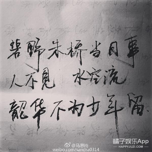 一个人的字多多少少也能体现出她的性格,马思纯的字大气洒脱,就像是不爱纠结、大大咧咧的她一样。有的时候他自己都会说自己不像个姑娘,但橘子君觉得,只有一个轻松的好心态才能让她拥有这样一个不像小女生的性格。