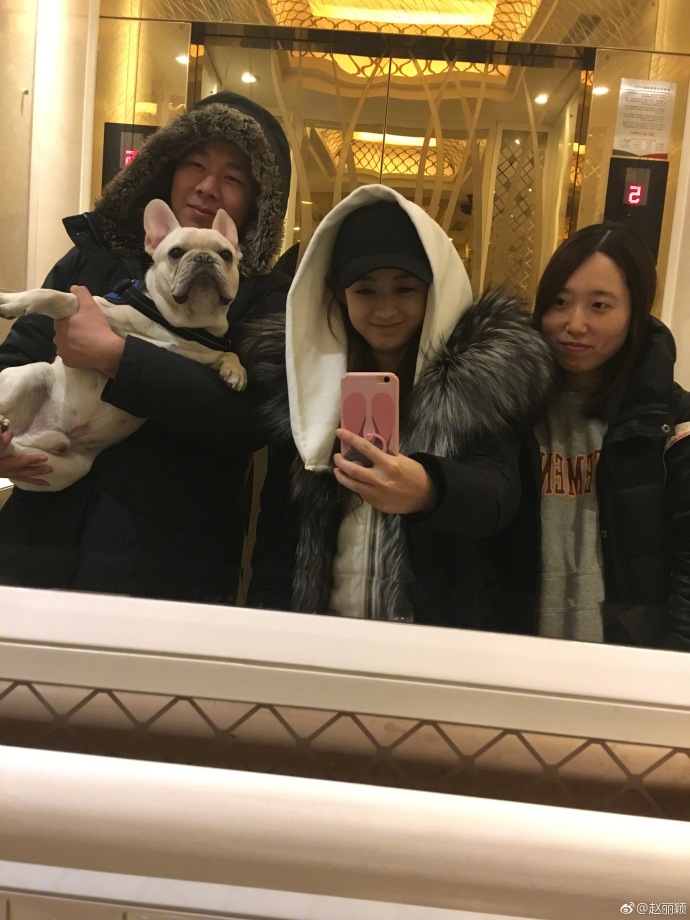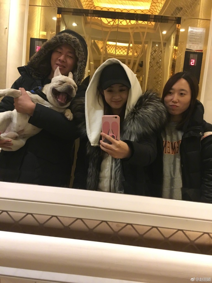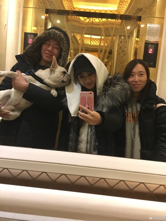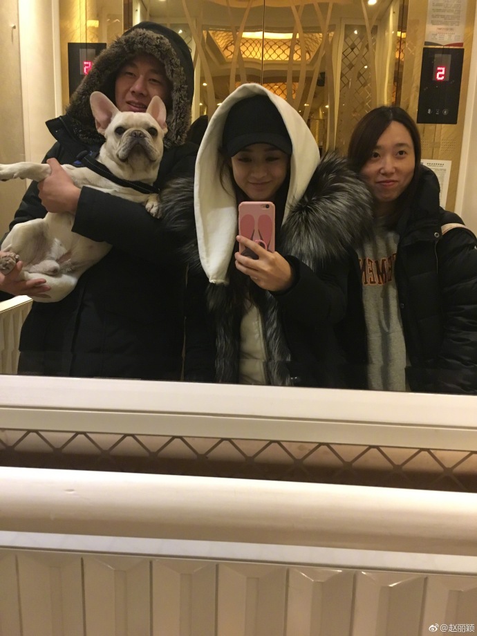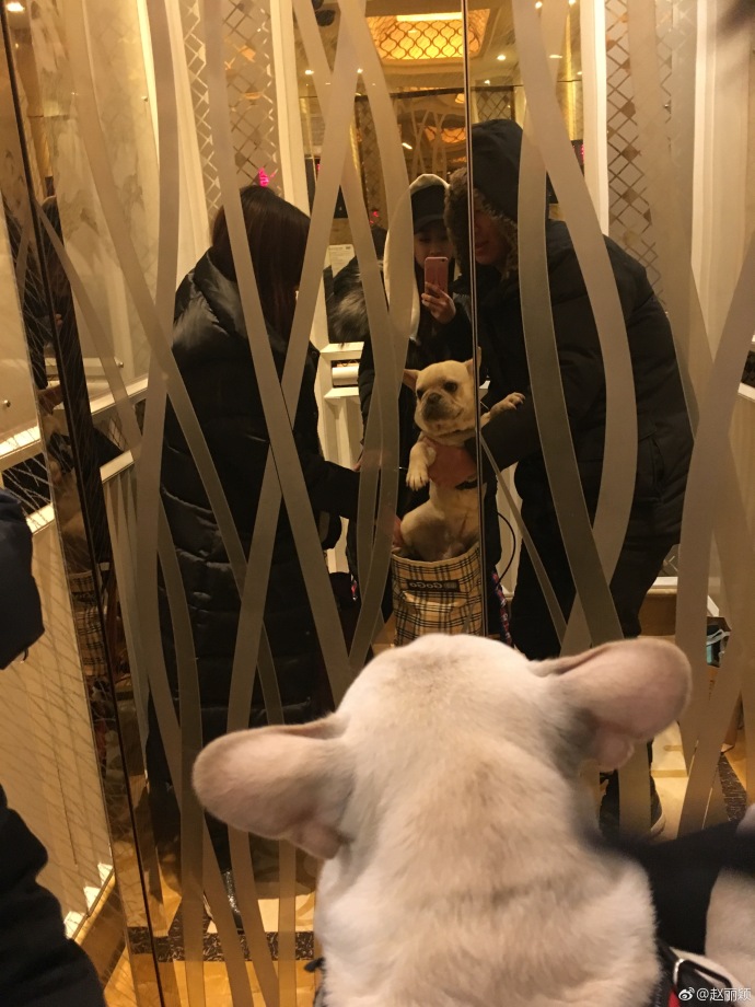 3月14日,赵丽颖在微博晒出与工作人员在电梯里的自拍,配文:“我们不缺白龙马,缺个师父。”照片中,赵丽颖戴着白色卫衣的帽子,小脸娇俏可爱,一旁狗狗的表情也十分抢镜。