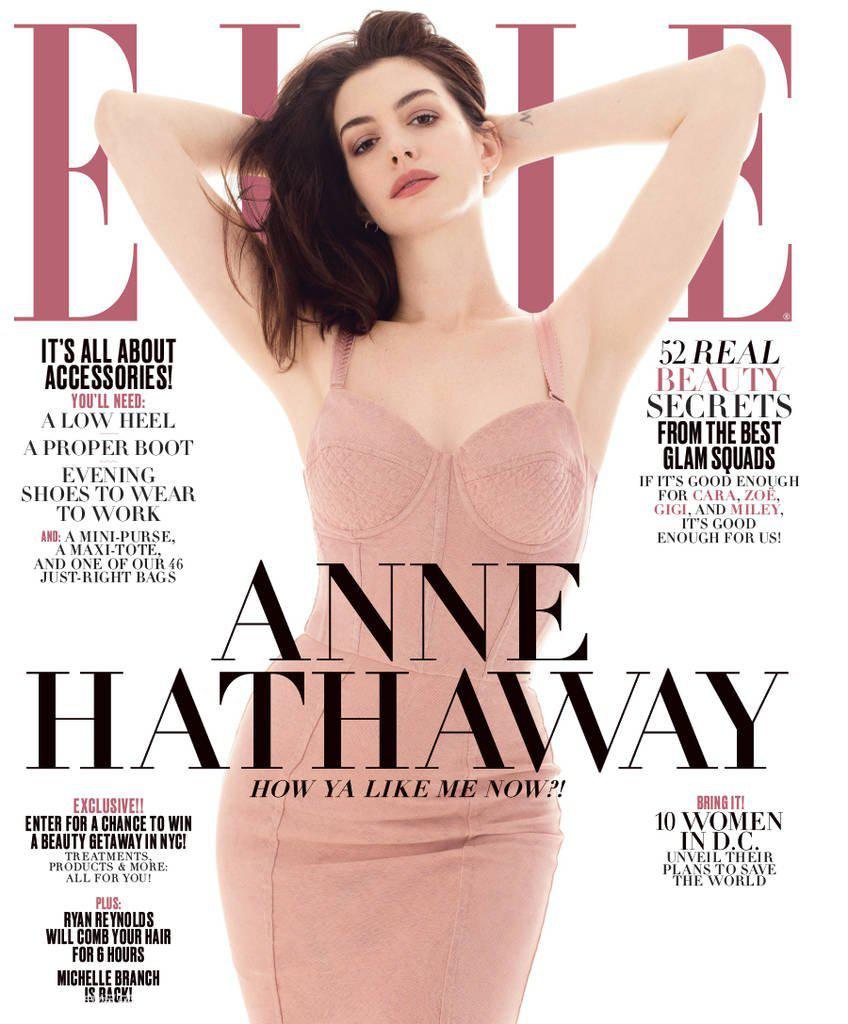 安妮-海瑟薇登上美国版《ELLE》4月刊封面,她身穿藕粉色吊带裙登上封面,双头抱头,大气清新扑面而来。