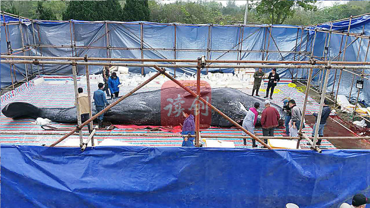 迷路抹香鲸在惠州解剖 体内发现两米长鲸宝宝