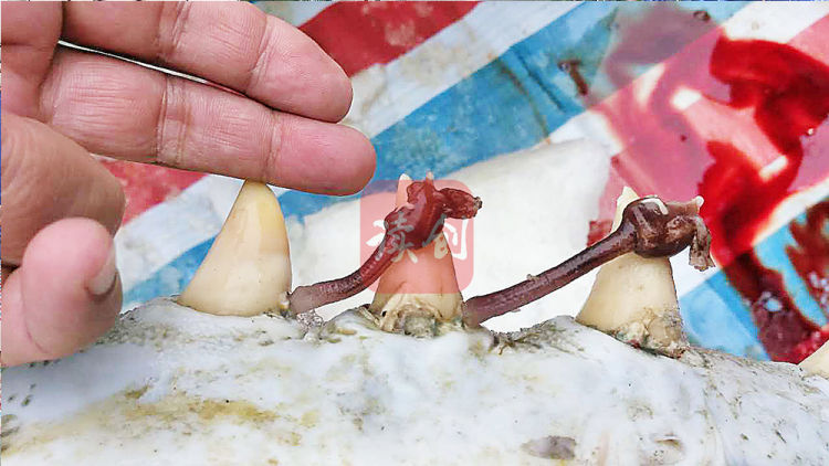 科研人员仔细地研究了抹香鲸的皮肤、尾部、头部、牙齿……现场科研人员测量抹香鲸嘴部,从嘴唇到嘴角是长1.6米的距离。而大家透过图片看到抹香鲸的牙齿上挂着两个褐色的东西,专家认为应该是寄生物。