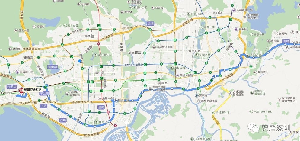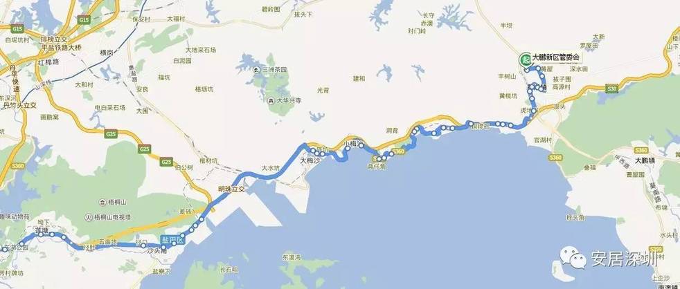 大鹏新区管委会、葵涌奔康西、葵涌办事处、葵涌老街、市场路口、葵兴小区、葵涌汽车站、葵涌中学、虎地排、土洋派出所、土洋市场、土洋医院、油库、玫瑰海岸、上洞村、万科十七英里、溪涌小学、溪涌市场、背仔角、华侨墓园、华侨墓园西门、海关小梅沙基地、小梅沙、梅沙街道办、大梅沙、东部华侨城、海港大厦、周大福大厦、沙头角保税区、盐田汽车站、盐田区政府、盐田防疫大楼、梧桐山隧道口、罗湖公安分局、畔山花园、聚宝路口、西岭下、罗湖体育馆2、黄贝岭、黄贝岭地铁站1、冶金大厦、文锦中学、春风万佳1、罗湖医院、滨江新村2、上步中学2、无委大厦、岗边村2、福滨新村2、联合广场、高级技校、福民新村、福田水围村、益田花园、益田村、妇幼保健院、新洲村、沙尾、上沙村2、天安数码城、招商银行大厦2、深航大厦2、福田交通枢纽。