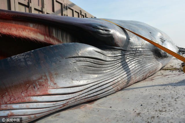 2015 年 11 月 28 日,在山东青岛,一头 3.86 吨的须鲸在距离海岸 8 公里处死亡。渔民发现时,尸体已经在海面上漂了几天。随后,青岛的渔政人员将须鲸从山东日照的码头运上岸,放入冷冻库处理。