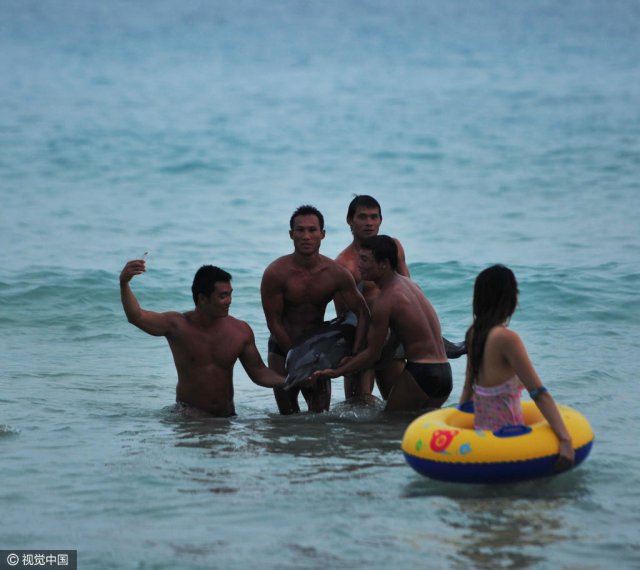 2013 年 6 月 16 日旁晚,海豚在三亚海滩上搁浅,游客急忙赶来救援,但救着救着就变了味,海豚仿佛变成了各大景区的景点,颇有些 " 到此一游 " 的意思。游客们争着抢着要和海豚合照,一拨又一拨。如果能在现场收个费,估计能赚不少钱 .
