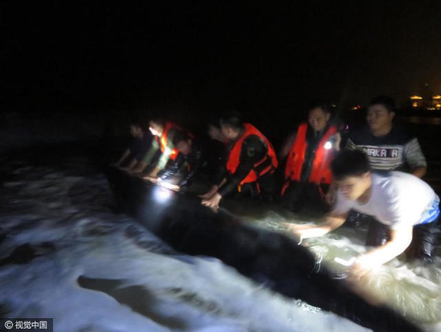 其实在我国,每年在海边遇难的珍贵动物不在少数。2017 年 1 月 17 日,一头 1.5 吨的长须鲸搁浅在深圳海陵岛保利银滩,武警官兵接到报警,第一时间赶到了现场。