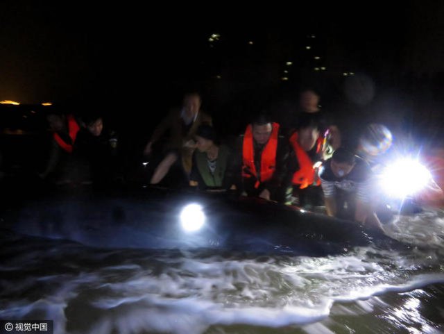 在冰冷的海水中,官兵们合力把长须鲸推回了海里。官兵们看着长须鲸游回海里,如释重负:" 鲸鱼终于回家过年了。"