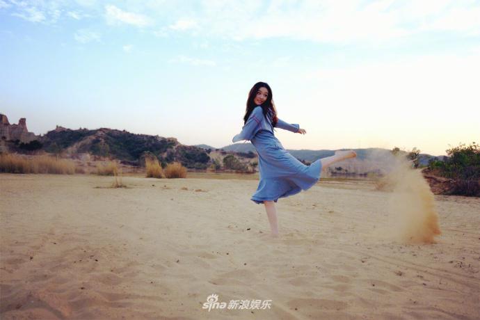 3月19日,林允在微博晒出一组照片,她穿着蓝色长裙,在沙滩玩耍,梨涡浅笑,少女感十足。
