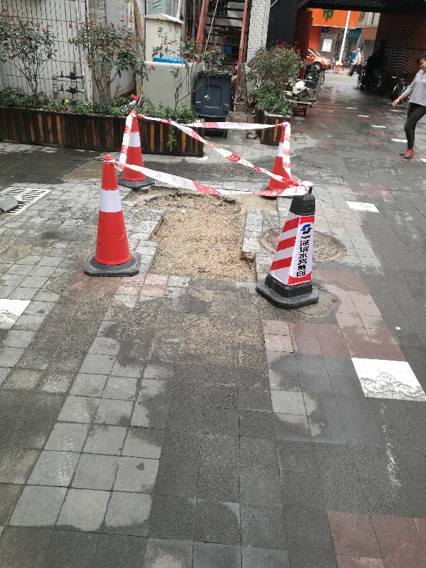 经过紧急处理后,中英街管理局随即聘请专业维修人员对现场进行勘察,并在抢修处立起雪糕桶拉上警示胶带提醒居民切勿靠近施工地点,随后工作人员找到漏水原因并对消防水管进行抢修。