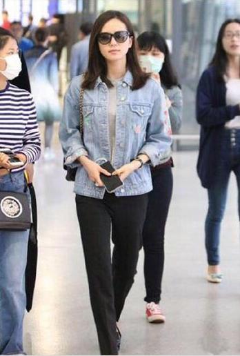 刘诗诗身穿蓝色刺绣花朵牛仔外套,内搭灰色上衣,下身搭配黑色休闲的九分裤脚踩黑色乐福鞋,简洁又帅气,休闲又时尚,难怪有粉丝称她为 “诗爷”。