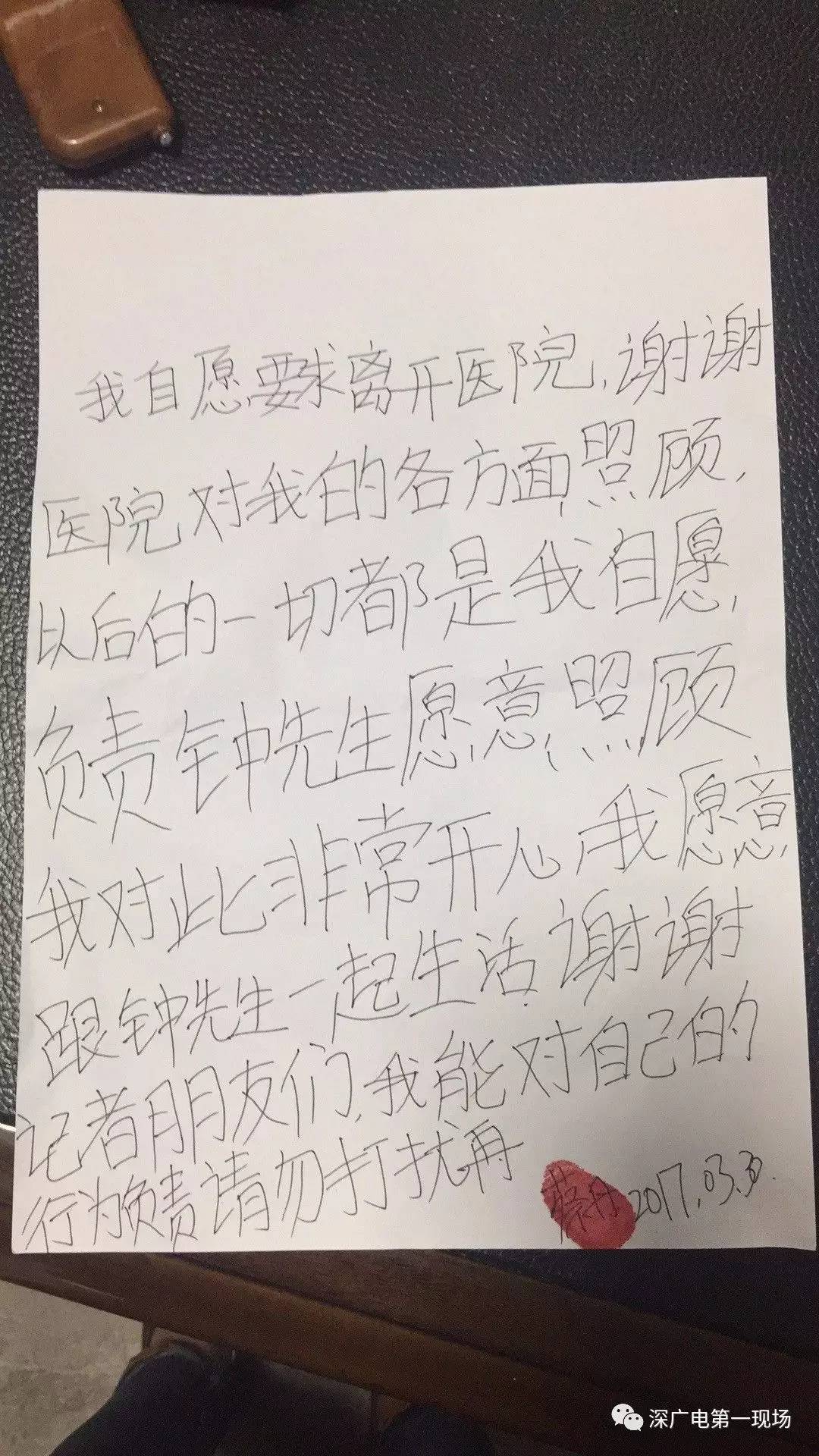他说自己在观澜一家工厂做电工,有能力照顾小蔡,并提出要带小蔡走。而小蔡当时执意离开,还写下了一封自愿书,特此声明。