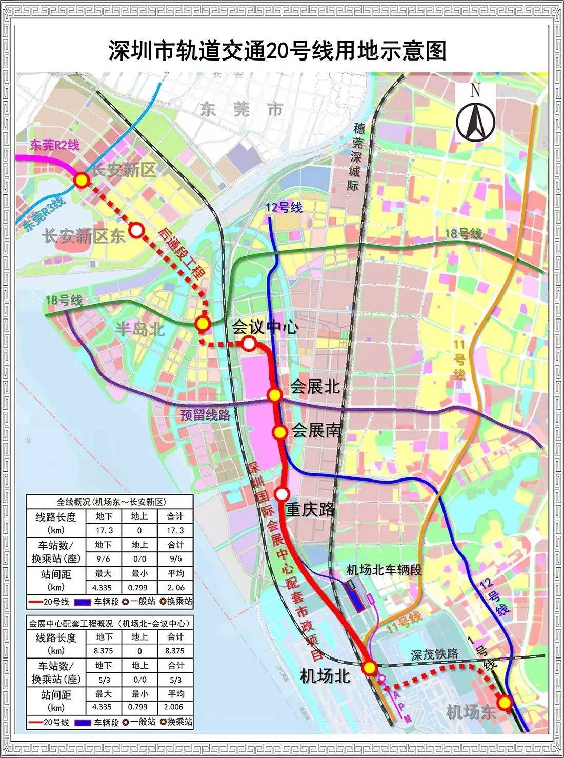 深圳地铁20号线起点为机场北站,终点为会议中心站,共设5个站点,分别为:机场北、重庆路、会展南、会展北、会议中心。