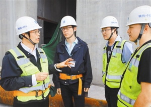 陆建新(左一)在平安金融中心建设工地对青工进行传帮带。 深圳特区报记者 邱海彬 摄