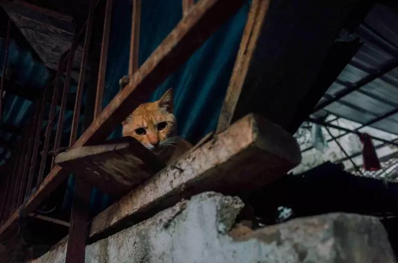 如今大部分住宿都成了空宅,一些废墟也成了流浪猫的栖息之地。这天巷子里正好下雨,遇见了两只可爱的大胖橘猫不知所措地在雨中来回奔走寻找庇护的地方。