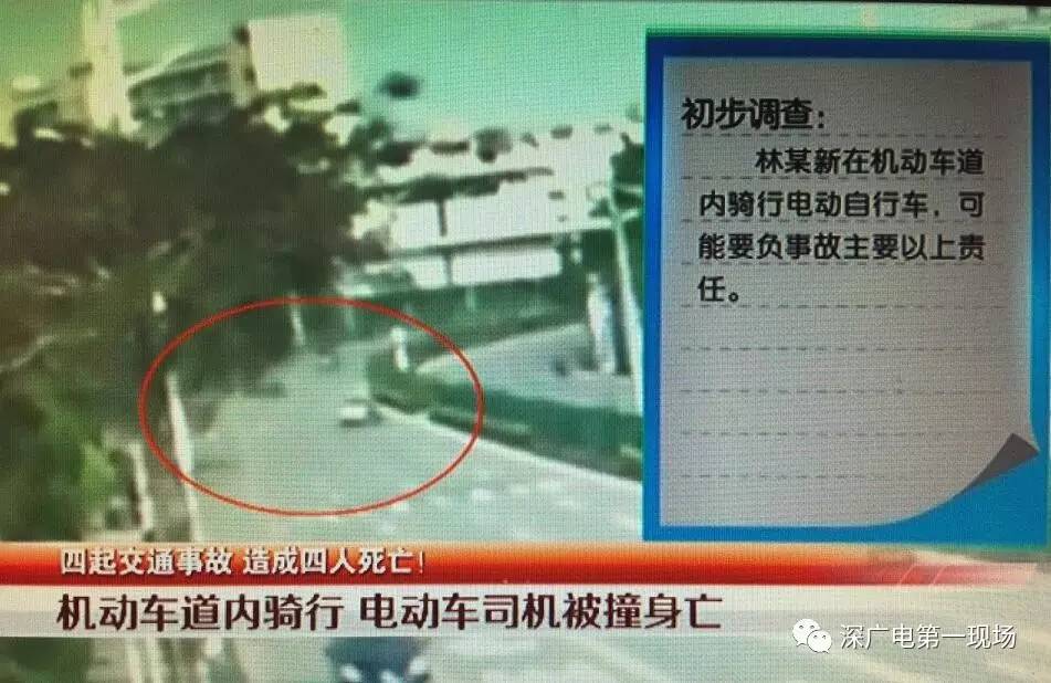 初步调查,林某新在机动车道内骑行电动自行车,可能要负事故主要以上责任。