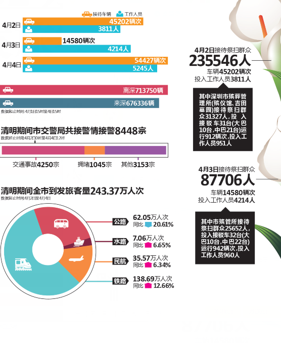 清明节日期间,全国大部分地区天气晴好,在旅游踏青、返乡祭祖等客流促进下,深圳陆海空铁旅客运输主要呈现以下特点:一是整体运行平稳,到发旅客总量小幅增长;二是得益于全市各大火车站加开班列,铁路增幅逾一成,所占比重达56.99%,较去年同期高出5.98%;三是民航、水路同步增长;四是受高铁及互联网组客等分流影响,公路下滑明显。(记者谢丽雯)