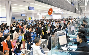大批内地居民参加港澳游旅行团挤满皇岗口岸出境大厅。黄俊生摄