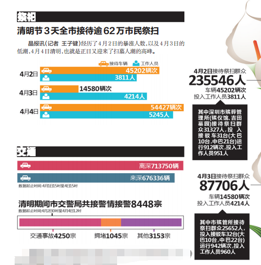 市交警局指挥中心值班主任陈宇达向记者介绍,清明期间,我市各主要墓园周边交通总体顺畅,但前往东部景区及梧桐山、深圳湾滨海红树林景区人流、车流剧增,导致以上景区周边道路车多缓行,部分路段出现交通拥挤。在外围高速方面,记者也了解到,4月1日15时至4日15时,我市共713750辆机动车离深,676336辆机动车来深。“我市前往惠州、河源、梅州、潮州、汕头等城市的市民非常多,导致惠盐高速、东部沿海高速等假期前两天离深方向车多排队。”陈宇达介绍,截至清明小长假最后一天的20时30分左右,我市各辖区依然未见明显的返程高峰,我市各高速公路及其收费站,各主干道、关口、口岸、机场、火车站及商圈、景点周边道路车流量正常,通行秩序良好。