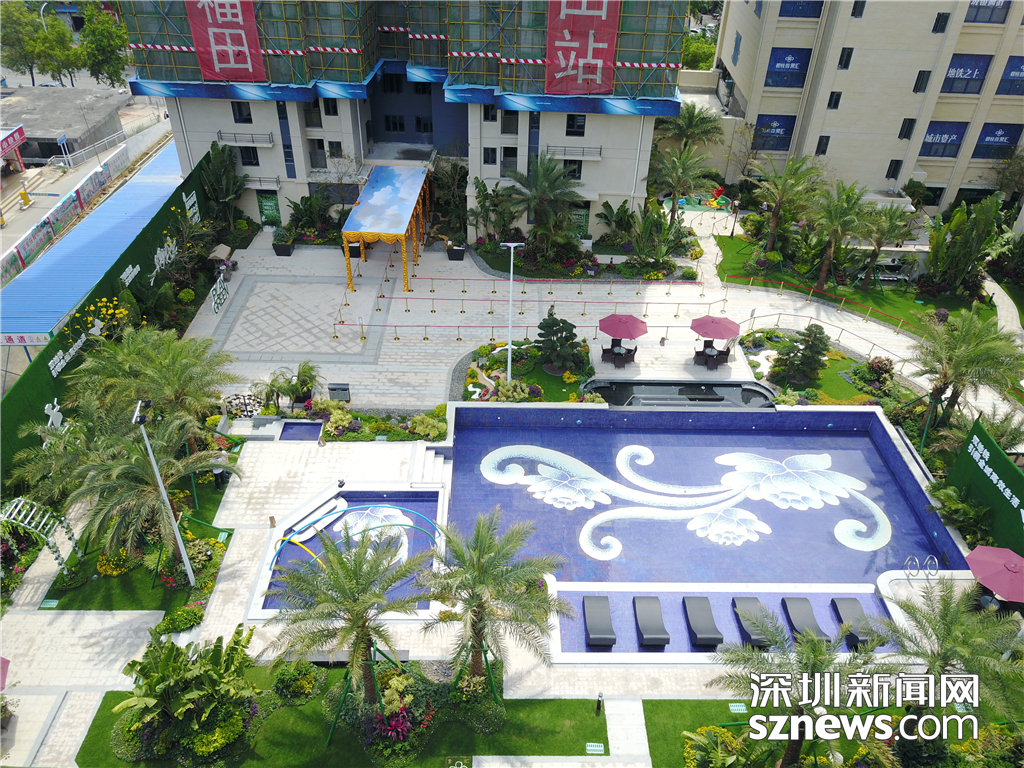 航拍深圳“豪华”安居房 图为碧桂园·荣汇项目内配套花园以及游泳池