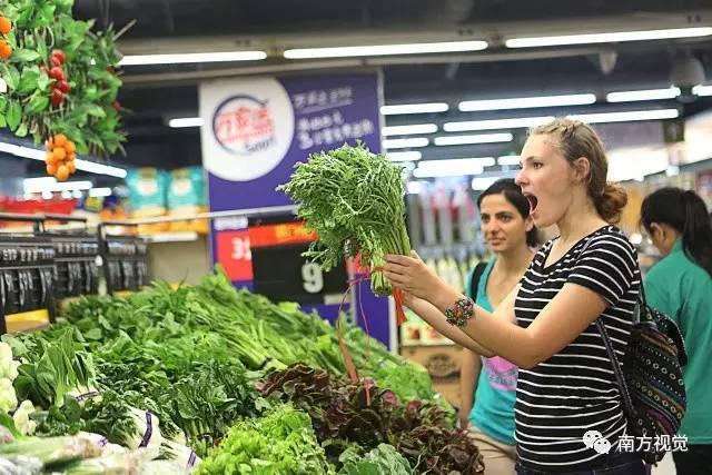 Galina和小伙伴在超市购物,看到葱绿的青菜,她拿起来左看右看,十分好奇。