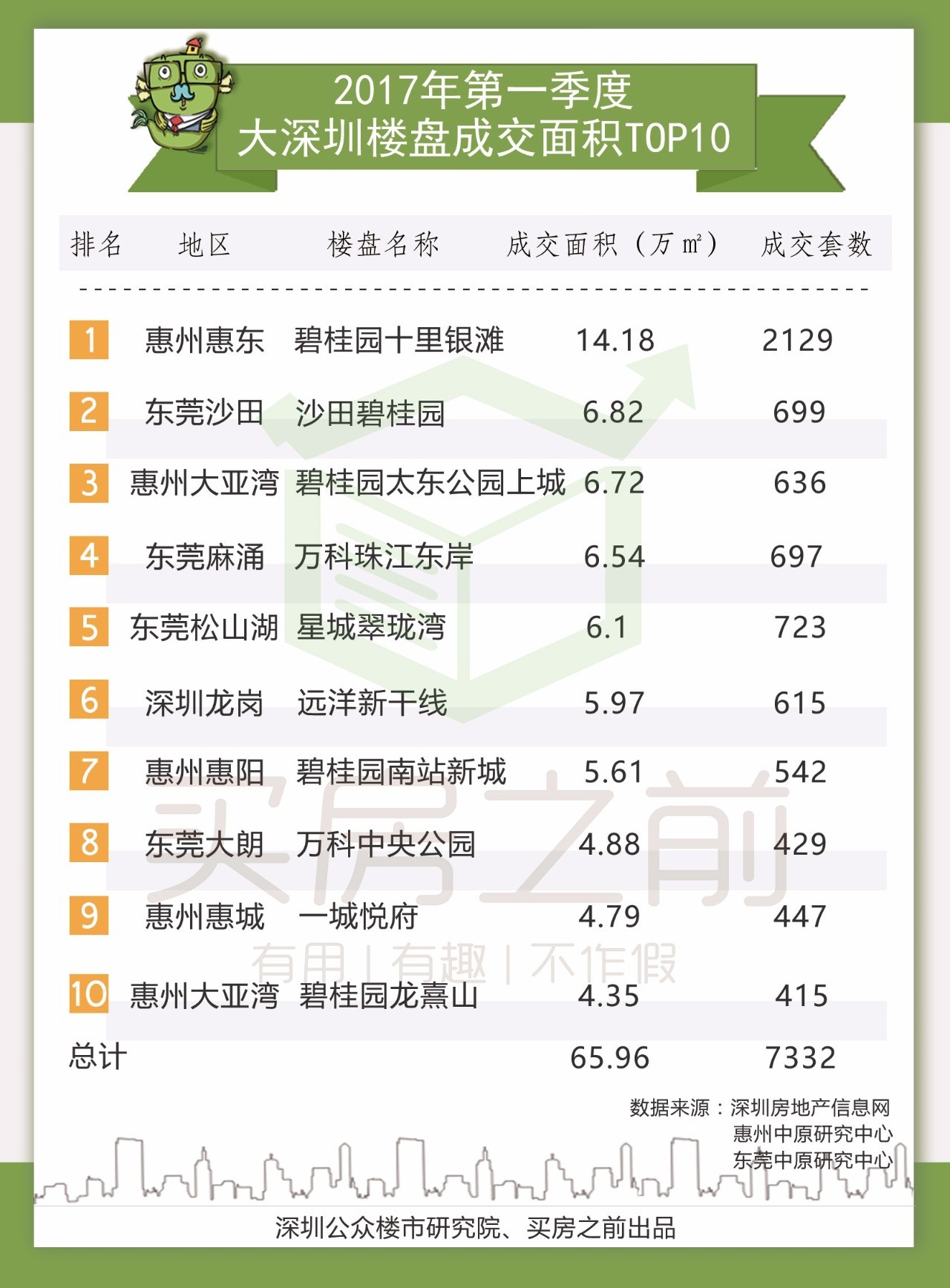 1.十里银滩蝉联榜首。从2016年大深圳全年榜单到2017年一季度榜单出炉,十里银滩似乎丝毫未受到调控政策影响,我行我素,套数与面积指标相当稳定,卖得很自信。