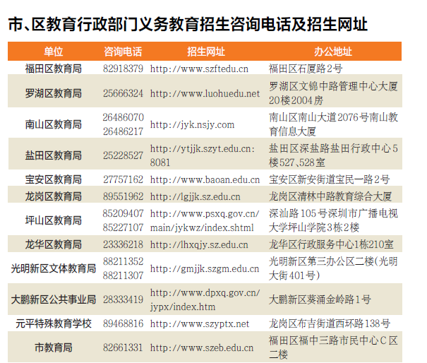 市、区教育行政部门义务教育招生咨询电话及招生网址