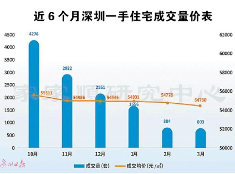 家家顺研究中心数据显示,自去年10月4日新政以来,深圳一手住宅成交量价便一路走低,到2017年3月全市成交803套,成交均价54370元/平方米,成交面积80302.44平方米,三项数据均已连续下跌6个月。