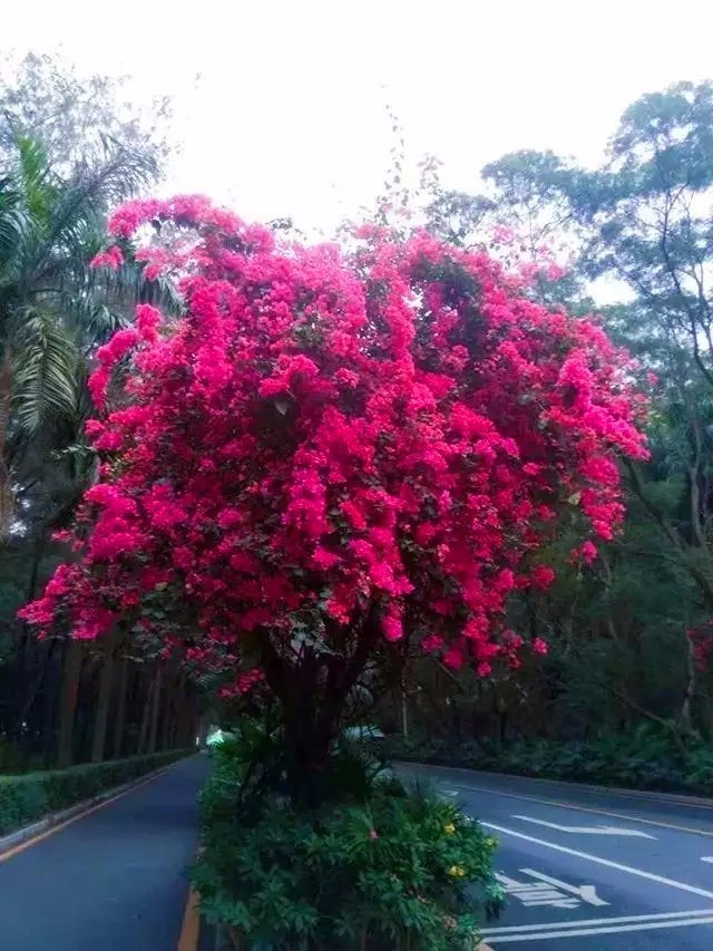 它是深圳市市花。深圳街头,绿化带、立交桥下,公园,小区院落、住户阳台上,常常能看到一簇簇、一丛丛娇艳夺目,三个花瓣喇叭似地,张开的紫色小花朵缀满枝头的簕杜鹃。