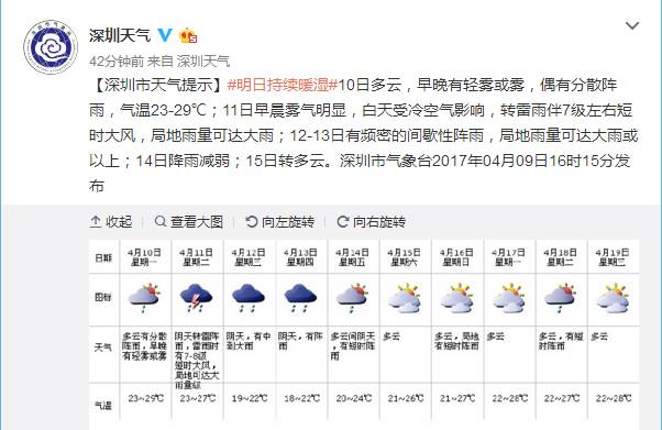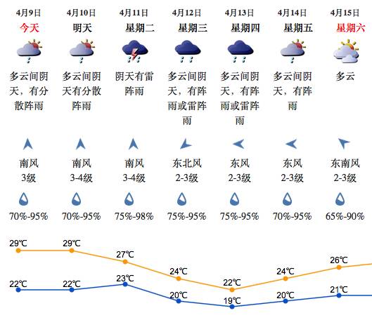10日多云,早晚有轻雾或雾,偶有分散阵雨,气温23-29℃;11日早晨雾气明显,白天受冷空气影响,转雷雨伴7级左右短时大风,局地雨量可达大雨;12-13日有频密的间歇性阵雨,局地雨量可达大雨或以上; 14日降雨减弱;15日转多云