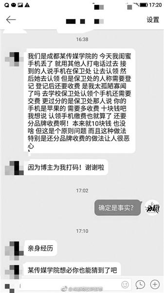 近日,四川传媒学院有学生在网上爆料称,自己陪同学去学校保卫处认领丢失的手机时,保卫处的人员称需要登记并收取费用,且不同手机要分品牌收费,苹果手机要收费10元。