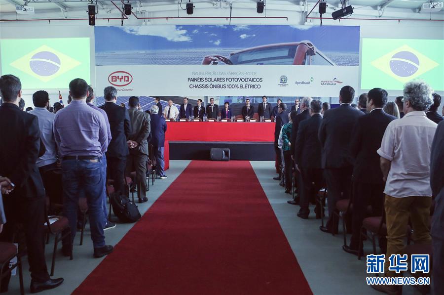 这是4月6日在巴西坎皮纳斯市拍摄的比亚迪工厂建成投产仪式。比亚迪巴西太阳能板厂和纯电动大巴底盘厂6日同时建成投产,这标志着比亚迪在巴西市场迈出具有里程碑意义的一步。新华社发(拉赫尔·帕特拉索摄)