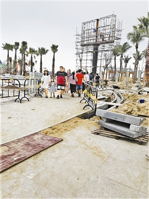 大梅沙海滨公园入口处,高耸入云的愿望塔被绿色安全网围住,隐约可看见现场几名工人正在施工修缮。出入口一旁原用于统计入园人数的闸机已被尽数拆除,目前尚未安装新的装备。市民们只能穿过公园门口尚未完工的工地进入沙滩,用护栏隔出的小路旁就是施工现场。据记者观察,公园门口只有部分地面完成方砖铺设,其余地面仍是未完工状态。这并不影响市民前来游玩的兴致,虽然没有到“下饺子”的程度,但沙滩已呈现人多拥挤的状态。记者看到,设置在沙滩一旁供市民摆放鞋子等物品的置物筒早已被塞满。