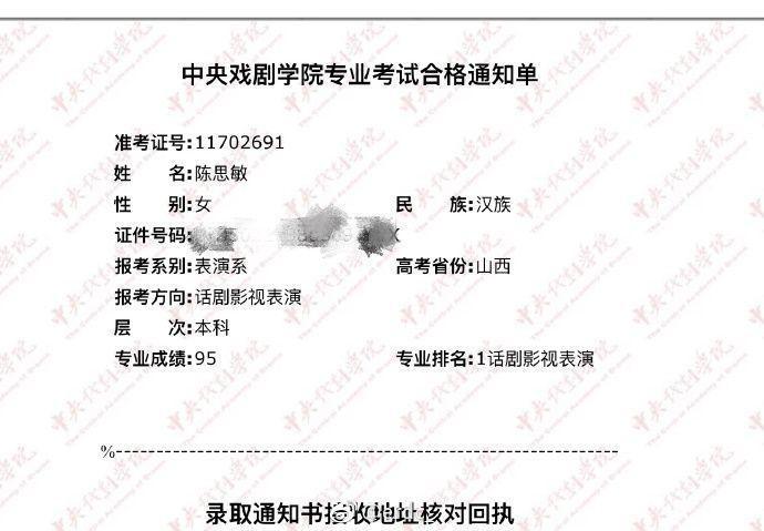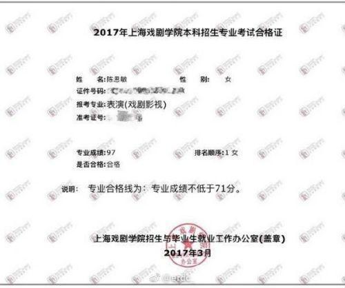 今天上午,陈思敏在自己微博上PO出中戏艺考成绩单后,收获一票点赞。