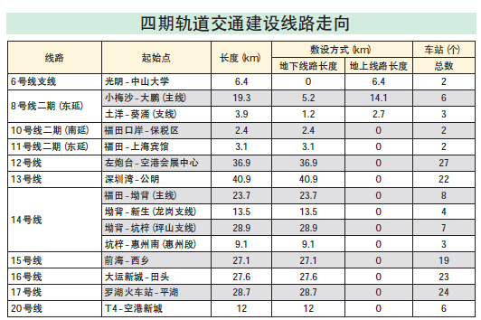 按照市委市政府的部署,今年我市将全面推进四期工程线路开工建设。在按程序报批的同时,深圳研究制定了四期建设方案。今年力争实现12、13、14、16号线以及6号线支线和8号线二期等工程全面开工,形成三期、四期工程同步实施、滚动发展的新格局。届时,全市轨道交通同步在建项目将达到18个,同步在建里程达到361公里。