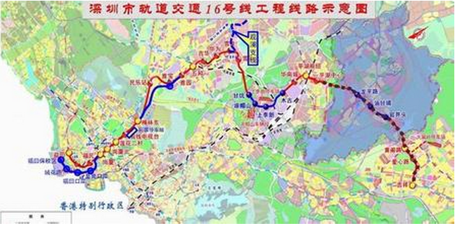 16号线:联系大运新城、龙岗中心城、坪山站及坪山新区等地区,是东部组团内部的轨道线路。线路由大运站引出,沿龙岗大道、黄阁路、龙平路敷设,经龙岗老中心后沿深汕公路往南至坪山站,经坪山中心区后沿东纵路、金田路敷设至终点田头。线路全长约27.6公里,设站23座,地下敷设。
