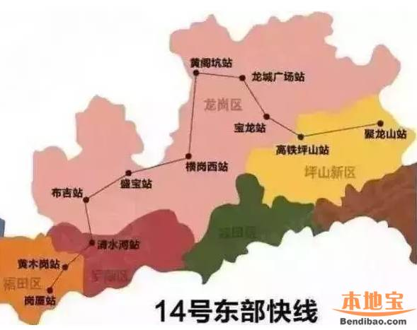 14号线:联系福田中心区、大运新城、龙岗中心区、坪山新城中心区的轨道快线。主线路起于福田中心区,沿深南大道、华富路、泥岗路、宝岗路、红棉路等道路敷设,在坳背附近分叉形成“Y”型线路,其中,坪山方向支线沿宝荷路、中山大道、深汕公路等道路敷设至深惠边界后进入惠州境内,线路沿深汕公路、白云一路、爱民路敷设至终点惠州南站;龙岗方向支线,沿黄阁路、清林路、龙翔大道敷设至3号线新生站,预留延伸至坪地的条件。线路主线长约23.7公里,设站8座;坪山(惠阳)支线长约38公里,设站10座,其中惠州境内长约9.1公里,设站3座;龙岗支线长约13.5公里,设站4座。深圳境内合计线路长约66.1 公里,地下敷设。