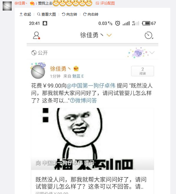 卓伟还颇有意思的在微博玩起了提问问答?更是有网友调侃道提问卓伟:试管婴儿怎么样了?