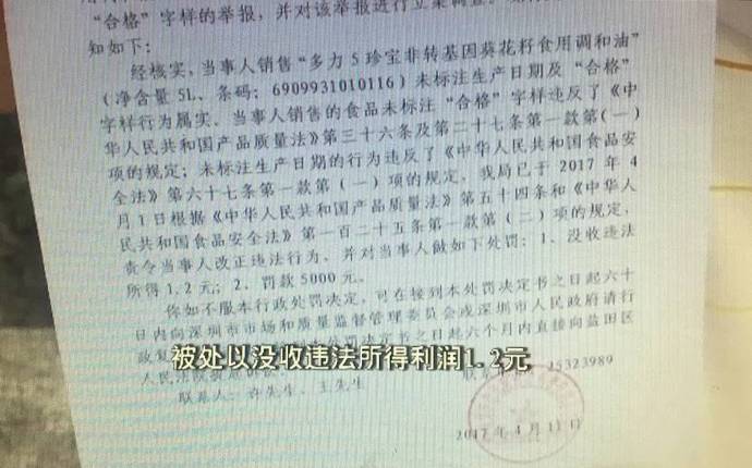 去年12月份庞先生在沃尔玛红岭店买了一桶多力牌食用油,发现竟然是无生产日期产品。随后庞先生向市场监督管理局反映了问题,相关部门也对此进行了立案调查,并作出了处罚结果。庞先生反映情况属实,沃尔玛销售没有生产日期产品违规,被处以没收违法所得利润1.2元和5000元罚款。沃尔玛(中国)的相关负责人表示,他们接受政府部门的处罚结果。