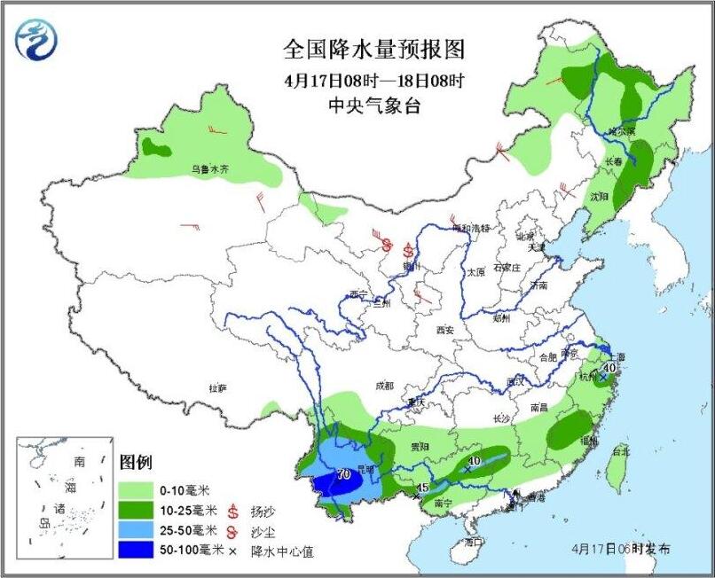 (2)17日江南和云南等地降雨天气,防范局地较强降雨可能引发的次生灾害及强对流天气的不利影响;